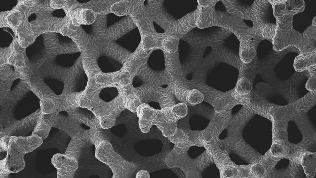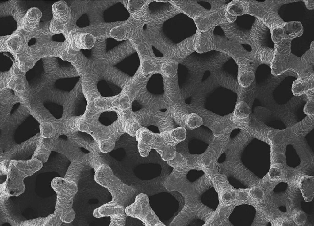 Auch Vor- und Nachteile der zementfreien Technik geben immer wieder und stetig Anlass zu wissenschaftlicher Diskussion. Zum einen ist bei zementfreier Verankerung theoretisch weniger Resektion am nativen Knochen notwendig. Dies scheint bei Primärimplantationen noch vernachlässigbar, wird jedoch durch den tieferen Zementeintritt in den Knochenstock bei Revisionen schlagend. Zum anderen sind postoperativ keine obsoleten Zementpartikel bzw. Zementabrieb im Gelenk zu befürchten. Beides ist vor allem in Anbetracht der jünger, aktiver und anspruchsvoller werdenden Patienten und der damit einhergehenden steigenden Wahrscheinlichkeit von Sekundäreingriffen von Relevanz. Für viele Chirurgen ist vor allem eine biologische und „physiologischere“ Osteointegration am Knochen-Prothesen-Interface wünschenswert.2 Gelingen soll dies durch die Migration von Osteoblasten und Mesenchymalzellen in Richtung der rauen und von Poren durchsetzten Oberfläche des Implantats. Hat diese Osteointegration einmal stattgefunden, ist eine Lockerung (in Abwesenheit von lytischen oder septischen Verhältnissen) unwahrscheinlich. Die Beschichtung zementfreier Implantate mit bioaktiven (osteokonduktiven) Oberflächen soll die Fixierung weiter unterstützen. Beschichtungen mit Hydroxylapatit (HA) können beispielsweise zur Umwandlung von Fasergebewebe in Knochen führen8 und so tibiale Mikrobewegungen mindern und die femorale und tibiale Stabilität erhöhen.9–11 Alternativ dazu bietet Trabecular MetalTM (Zimmer Biomet, Warsaw, Indiana) eine poröse Oberflächenbeschaffenheit aus Tantal, das die native Trabekelstruktur des Knochens nachahmen12 und so ein Einwachsen ermöglichen soll (Abb.2).13,14 Auch bieten neue Herstellungsmethoden mit Titanpulver, wie beispielsweise BIOFOAM (Microport Orthopedics Inc., Arlington, Tennessee), eine mikroskopische Oberflächenstruktur mit variabler Porosität und Stärke,15 die der Oberfläche des trabekulären Knochens sehr ähnlich ist. Voraussetzung für eine optimale Osteointegration sind jedoch immer eine exakte knöcherne Schnittführung und die damit einhergehende Primärstabilität. Es sollen so Mikrobewegungen am Interface, welche die Primärstabilität senken und so die Wahrscheinlichkeit für Osteointegration mindern, verhindert werden.16,17 Schlussendlich soll das Argument der Zeitersparnis bei ausbleibender Zementiertechnik bzw. fehlendem Abwarten der Aushärtezeit erwähnt sein. Die Vorteile der zementierten Verankerung von Knietotalendoprothesen ergeben sich aus den oben genannten Argumenten (höhere Primärstabilität und leichtere chirurgische Fixierung durch den Ausgleich unregelmäßiger Knochenschnitte bzw. von Knochendefekten). Auch stellt die Zementschicht eine gewisse Barriere dar, um das Knochen-Interface vor Polyethylenabrieb zu schützen und so ggf. Osteolysen zu verhindern.18 Zuletzt besteht die Option einer Anreicherung des Zementmaterials mit verschiedenen antibiotischen Wirkstoffen. Weiterhin offen bleibt die Frage nach der optimalen Selektion der Patienten, vor allem in Hinsicht auf schlechte Knochenqualität. Auch finanzielle Aspekte sind zu berücksichtigen. Zementfreie Knietotalendoprothesen kosten in der Mehrheit aller Länder aufgrund der aufwendigeren Herstellung deutlich mehr als die vergleichbaren zementierten Implantate, in Österreich beispielsweise um 20–25%. Die Differenz schwindet naturgemäß bei Berücksichtigung der Zementkosten. Es wird weiters argumentiert, dass die Kostendifferenz durch geringere OP-Dauer und die damit einhergehenden geringeren OP-Kosten zusätzlich gemindert werde.19