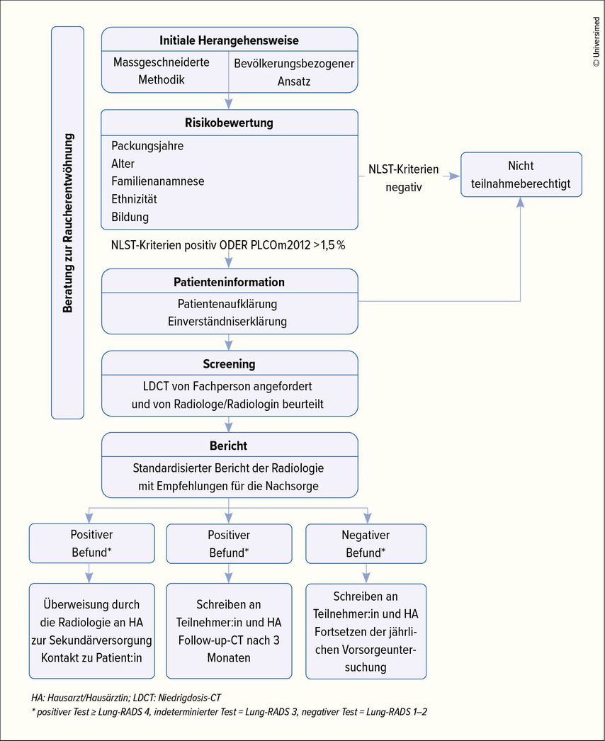 Die Struktur des Lungenkrebsfrüherkennungsprogramms in Zürich richtet sich nach internationalen Empfehlungen, die bereits in verschiedenen Programmen zur Anwendung kommen. Abbildung 1 stellt den Ablauf des Programms in Zürich dar. Die Rekrutierung erfolgt sowohl über ärztliche Zuweiser (Hausärzte, Pneumologen u.a.) als auch über die Möglichkeit der Selbstzuweisung von Interessierten, die durch Medienberichte oder Flyer in Wartezimmern auf das Programm aufmerksam geworden sind.