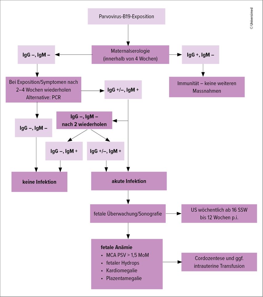 1 Cossart YE et al.: Parvovirus-like particles in human sera. Lancet 1975; 1(7898): 72-3 2 Heegaard ED, Brown KE: Human parvovirus B19. Clin Microbiol Rev 2002; 15(3): 485-505 3 Lamont RF et al.: The epidemiology, diagnosis and management of human parvovirus B19 infection in pregnancy: a review. BJOG 2011; 118(2): 175-86 4 Cohen BJ, Buckley MM: The prevalence of antibody to human parvovirus B19 in England and Wales. J Med Microbiol 1988; 25(2): 151-3 5 ECDC. Rapid Risk Assessment: Ongoing outbreak of Parvovirus B19 in Europe. 2025 6 Young NS, Brown KE: Parvovirus B19. N Engl J Med 2004; 350(6): 586-97 7 Brown KE et al.: Erythrocyte P antigen: cellular receptor for B19 parvovirus. Science 1993; 262(5130): 114-7 8 Nordholm AC et al.: Epidemic of parvovirus B19 and disease severity in pregnant people, Denmark, January to March 2024. Euro Surveill 2024; 29(24): 2400299 9 Jordan JA, DeLoia JA: Globoside expression within the human placenta. Placenta 1999; 20(2-3): 103-8 10 Yaegashi N et al.: Human parvovirus B19 infection during pregnancy and hydrops fetalis: relationship to gestational age and maternal immune status. J Infect Dis 1998; 178(6): 1783-6 11 Soderlund M et al.: Diagnosis of primary B19 infection by detection of specific IgM antibodies. J Infect Dis 1995; 171(2): 262-6 12 Aberham C et al.: Real-time PCR detection of B19 DNA in blood donors. J Clin Microbiol 2001; 39(11): 4412-4 13 Enders M et al.: Prenatal diagnosis of fetal parvovirus B19 infection: value of ultrasound and Doppler findings. Ultrasound Obstet Gynecol 2004; 23(5): 512-8 14 Mari G et al.: Noninvasive diagnosis by Doppler ultrasonography of fetal anemia. N Engl J Med 2000; 342(1): 9-14 15 Daffos F et al.: Fetal blood sampling via umbilical cord puncture. N Engl J Med 1983; 308(21): 1322-4 16 Ville Y et al.: Intrauterine transfusion for non-immune fetal hydrops. Fetal Diagn Ther 1990; 5(1): 19-27 17 Rodis JF et al.: Management of parvovirus infection in pregnancy and outcomes of hydrops: a prospective study. Am J Obstet Gynecol 1998; 179(5): 1250-3 18 Porter HJ et al.: Long-term follow-up of children with intrauterine transfusion for parvovirus B19 infection. Prenat Diagn 2014; 34(7): 664-8 19 Young NS, Brown KE: Parvovirus B19 vaccines. Hum Vaccin Immunother 2013; 9(1): 74-9 20 Public Health England, Guidance: Parvovirus B19 infection and pregnancy. 2023