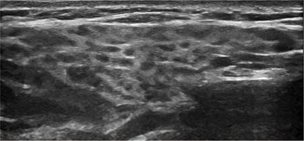 Fig. 2: Échographie de la glande parotide, grade 2 selon l’OMERACT: manques d’uniformité de la texture de la glande parotide avec de multiples zones hypo- à anéchogènes qui sont encore entourées de tissu normal