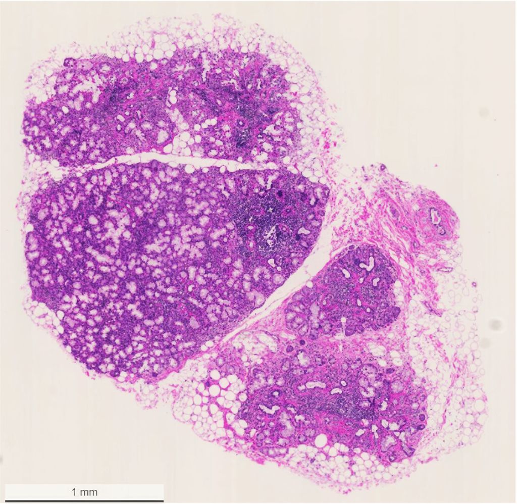 La biopsie des glandes salivaires reste néanmoins un élément central du diagnostic, mais elle n’est pas obligatoire si le reste du tableau clinique est clair. Sous anesthésie locale, plusieurs lobes de glandes salivaires sont prélevés, en général sur la face interne de la lèvre inférieure, en prenant soin de ne pas endommager les vaisseaux et les nerfs. La mise en évidence histologique de foyers lymphocytaires – infiltrats focaux, généralement périduraux, composés d’au moins 50 lymphocytes et histiocytes – est caractéristique de la SjD (Fig.3). Le «focus score» décrit le nombre de ces foyers par 4mm2 de tissu glandulaire. Un score ≥1 est considéré comme déterminant pour le diagnostic de la SjD, mais n’est pas pathognomonique. Par exemple, une infection par le VIH non traitée peut avoir une présentation histologique très similaire dans les glandes salivaires.16 D’autre part, la biopsie des glandes salivaires contribue fortement au diagnostic différentiel, par exemple pour faire la distinction avec les maladies liées aux IgG4, la sarcoïdose, l’amylose ou les processus malins, qui peuvent également être à l’origine des symptômes du syndrome sec. La mise en évidence de centres germinaux ectopiques est en outre importante pour le pronostic, car le risque de lymphome peut être multiplié par 7,8, selon les études.17