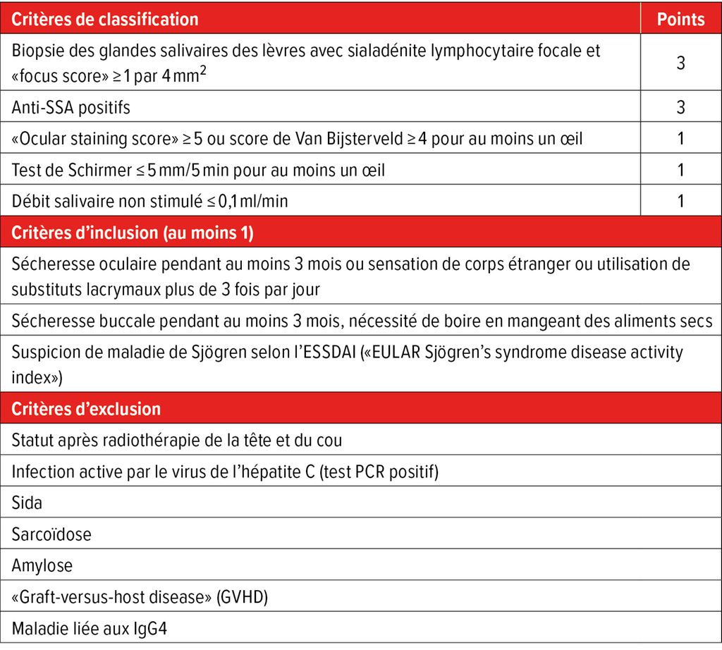 Tab.1: Critères de classification 2016 de l’ACR/EULAR pour la maladie de Sjögren. Les critères de classification sont remplis si au moins 4 points, au moins 1 critère d’inclusion et 0 critère d’exclusion sont atteints