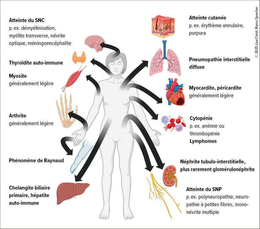 La Figure 1 fournit un aperçu des manifestations systémiques les plus fréquentes dans la SjD.