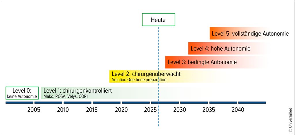 1 Jacofsky DJ, Allen M: Robotics in arthroplasty: a comprehensive review. J Arthroplasty 2016; 31(10): 2353-63 2 St Mart JP, Goh EL: The current state of robotics in total knee arthroplasty. EFORT Open Rev 2021; 6(4): 270-9. doi: 10.1302/2058-5241.6.200052. PMID: 34040804; PMCID: PMC8142057 3 Deckey DG et al.: The future of robotic surgery in joint arthroplasty: Current platforms, emerging technologies and outlook for 2035. Orthopadie (Heidelb) 2025; 54(9): 682-92 4 Heinz T et al.: Trends in computer-assisted surgery for total knee arthroplasty in Germany: an analysis based on the operative procedure classification system between 2010 to 2021. J Clin Med 2023; 12(2): 549 5 Agarwal N et al.: Clinical and radiological outcomes in robotic-assisted total knee arthroplasty: a systematic review and meta-analysis. J Arthroplasty 2020; 35(11): 3393-409.e2 6 Shaw JH et al.: Minimal clinically important difference in robotic-assisted total knee arthroplasty versus standard manual total knee arthroplasty. J Arthroplasty 2021; 36(7S): 233-241 7 Varshneya K et al.: Imageless computer navigation reduces 5-year all-cause revision rates after primary total knee arthroplasty. J Arthroplasty 2022; 37(6S): 211-5 8 Zhang JJY et al.: Cost-effectiveness of robot-assisted total knee arthroplasty: a Markov decision analysis. J Arthroplasty 2023; 38(8): 1434-7 9 Hua Y, Salcedo J: Cost-effectiveness analysis of robotic-arm assisted total knee arthroplasty. PLoS One 2022; 17(11): e0277980