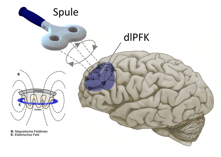 Abb. 1: Repetitive transkranielle Magnetstimulation (rTMS) am dorsolateralen präfrontalen Kortex (dlPFK)