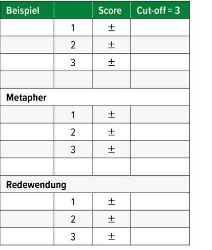 Im Rahmen des Erstgesprächs – oder zu einem späteren Zeitpunkt – präsentieren Therapeut:innen drei Beispiele und drei Metaphern/Redewendungen und beobachten die Reaktionen der Klient:innen.