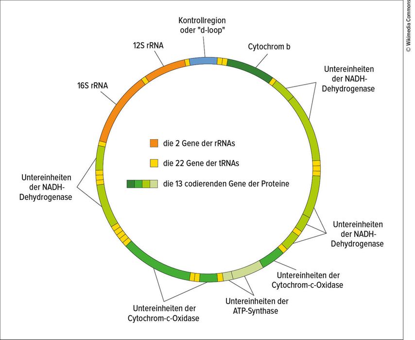 Die mitochondriale DNA ist ein kleines kreisförmiges Molekül, bestehend aus 16569 Basenpaaren. Sie wird nur von der Mutter vererbt. In jeder unserer Zellen liegt die mitochondriale DNA in Hunderten von Kopien vor. Sie verfügt über einen speziellen genetischen Code, der sich von dem universellen genetischen Code unterscheidet. Das bedingt, dass das Molekül eigene Gene für tRNAs und rRNAs hat, um diesen Code zu übersetzen.