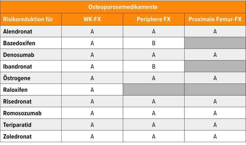 Tab. 2: Leitlinie DVO 2023, FX = Fraktur, WK = Wirbelkörper, Periphere = Extremitäten, Proximale Femur = am körpernahen Ende des Oberschenkelknochens, A = Klasse-A-Empfehlung (Standardtherapie), B = Klasse-B-Empfehlung (situationsabhängig empfohlen), Klasse O: optional