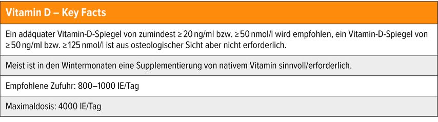 Daraus ergeben sich verbreitete Fehlinformationen und Mythen, denen im ärztlichen Gespräch begegnet werden muss. Einer dieser Mythen lautet: „Ich brauche kein Vitamin D, ich gehe viel in die Sonne.“ Diessei insofern unrichtig bzw. problematisch, als die Vitamin-D-Synthese erst ab einem UV-Index (UVI) von 3 möglich ist. In Österreich liegt der UVI allerdings von Oktober bis Februar zumeist unter 2, sodass keine Synthese möglich ist und folglich Supplementation erforderlich ist, erläuterte Kocijan und kam damit zum zweiten Mythos: „Viel Vitamin D hilft besser als weniger Vitamin D.“ Kocijan: „An diesem Mythos sind wir Osteologen nicht ganz unschuldig, denn wir haben es bis heute nicht geschafft, korrekte Referenzwerte für Vitamin D anzugeben.“ Internationale Leitlinien empfehlen jedoch einen Vitamin-D-Spiegel von zumindest 20ng/ml bzw. 50nmol/l (Tab. 1). Ab einem Vitamin-D-Spiegel von 50ng/ml bzw. 125nmol/l bringt eine weitere Erhöhung aus osteologischer Sicht jedoch keinen weiteren Benefit.2 Dies macht Supplementation in den Wintermonaten zwar empfehlenswert, die Zielwerte sind jedoch in aller Regel mit einer sehr geringen Dosis von 800 bis 1000 IE pro Tag erreichbar. Bei Osteoporosepatient:innen können höhere Dosierungen erforderlich sein, die empfohlene Maximaldosis liegt jedoch bei 4000 IE pro Tag.