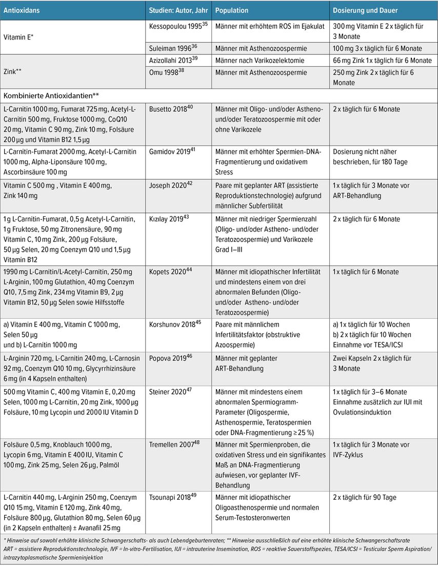 Antioxidantien neutralisieren ROS und sollen so die Spermienqualität verbessern. Zu den am häufigsten untersuchten Substanzen gehören Vitamin C, Vitamin E, Zink, Selen, Folsäure, Carnitin, Carotinoide, Coenzym Q10 (Ubiquinol) und Cystein, welche oral eingenommen werden.27,28