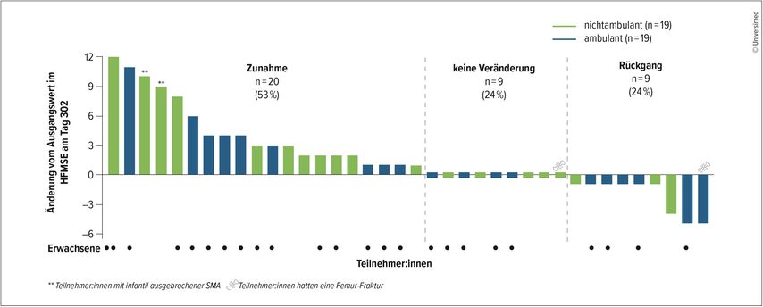 Abb. 1: 53% der Teilnehmer:innen der DEVOTE-Studie hatten eine verbesserte motorische Fuktion unter erhöhter Nusinersen-Dosis. Die Verbesserungen wurden anhand der Hammersmith Functional Motor Scale Expanded (HFMSE) nach 302 Tagen unter Nusinersen 50/28mg erfasst7
