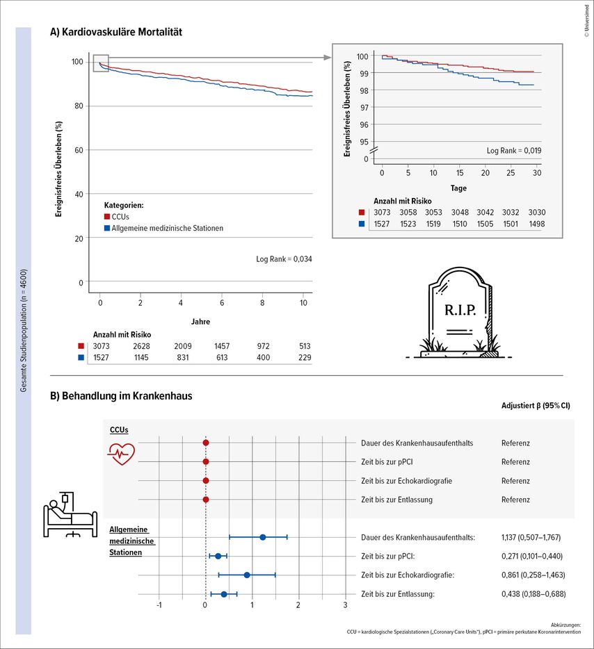 Abb. 1: Studie am AKH Wien zur Versorgung von Patienten nach akutem Koronarsyndrom. A) Kardiovaskuläre Mortalität. B) Versorgung im Krankenhaus (übersetzt aus Steinacher E et al.: Eur Heart J 2025)8