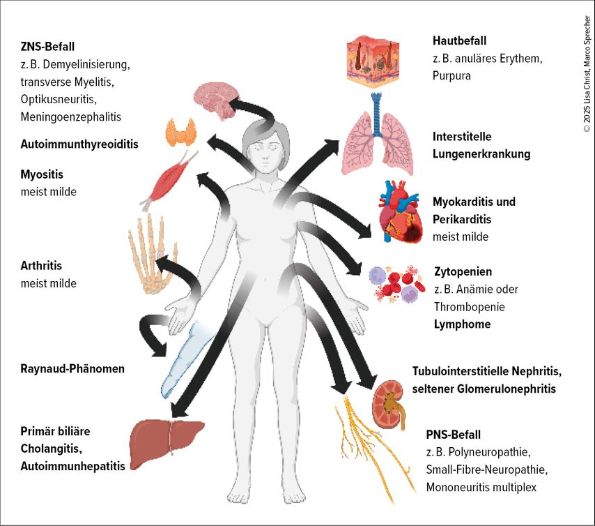 Abb. 1: Übersicht über die häufigsten extraglandulären Manifestationen bei der Sjögren-Erkrankung (mit © Biorender erstellte Grafik)
