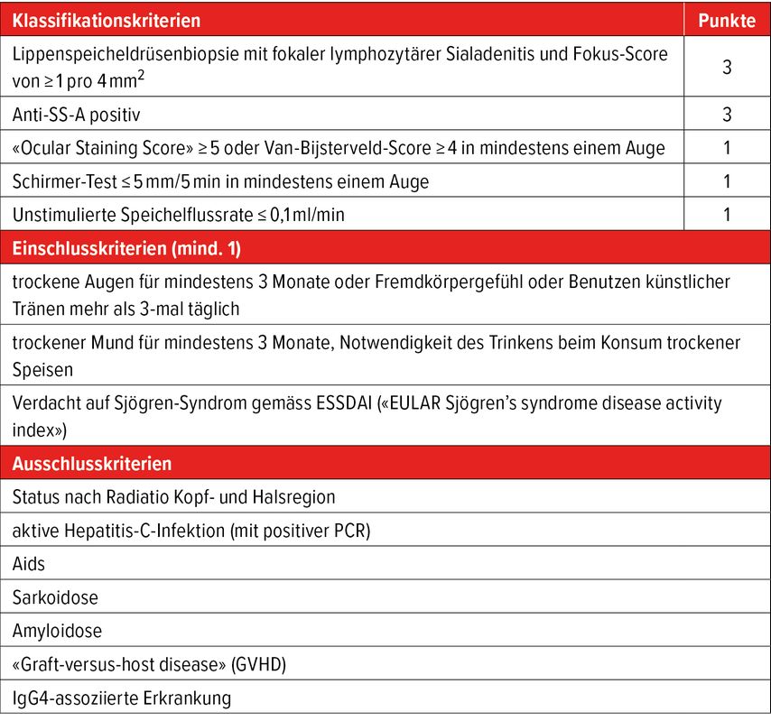Tab. 1: ACR/EULAR-Klassifikationskriterien für die Sjögren-Erkrankung 2016. Die Klassifikationskriterien sind erfüllt, wenn mindestens 4 Punkte, mindestens 1 Einschlusskriterium und kein Ausschlusskriterium erreicht werden