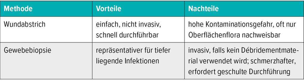 Die Wahl der Probennahme beeinflusst maßgeblich die Qualität der mikrobiologischen Diagnostik. Dabei werden häufig Wundabstriche, selten Gewebebiopsien verwendet (Tab.1). Während der Wundabstrich häufig in der Routine eingesetzt wird, liefert die Gewebebiopsie aussagekräftigere Ergebnisse, insbesondere bei tiefen oder chronischen Wundinfektionen.