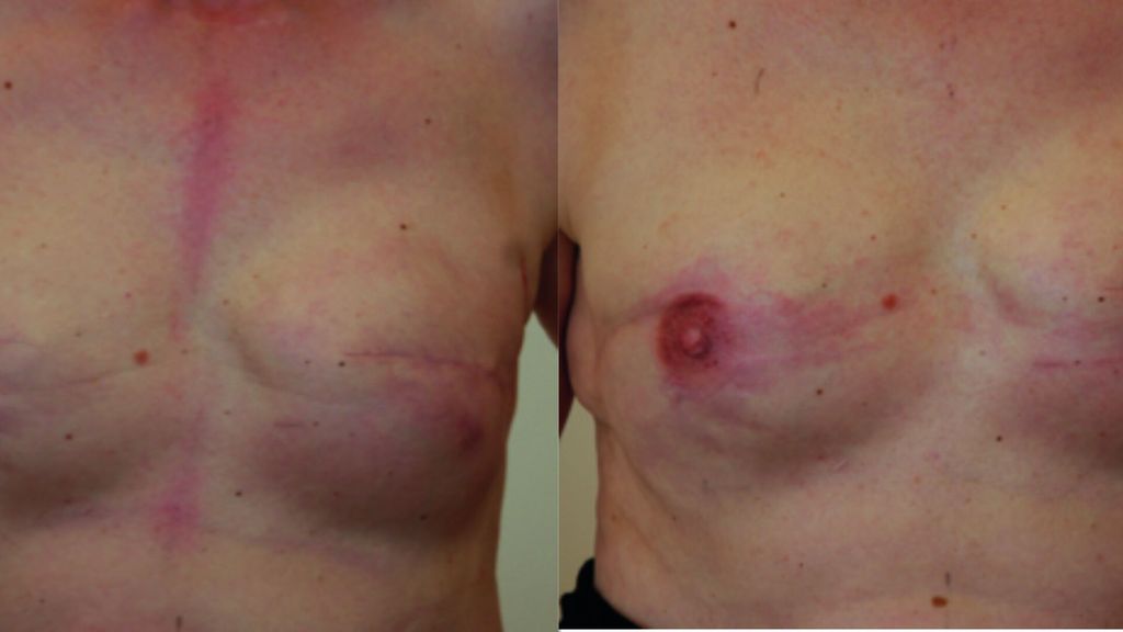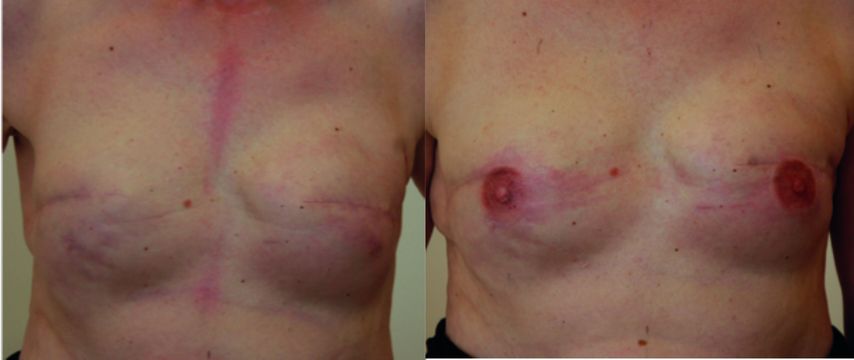 Abb. 1: Klinisches Bild einer Patientin nach subkutaner Mastektomie und Sofortrekonstruktion mittels Implantaten vor und unmittelbar nach Rekonstruktion des Mamillen-Areola-Komplexes durch Medical Tattooing