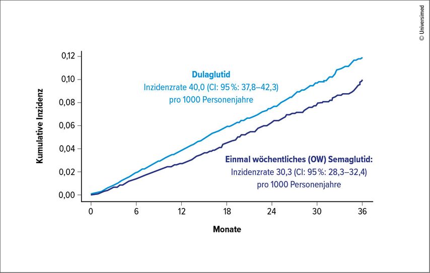 In einer Kohortenstudie mit über 58000 Patient:innen mit DT2 und ASCVD zeigte Semaglutid eine signifikant niedrigere Rate von 3-Punkte-MACE als Dulaglutid.
