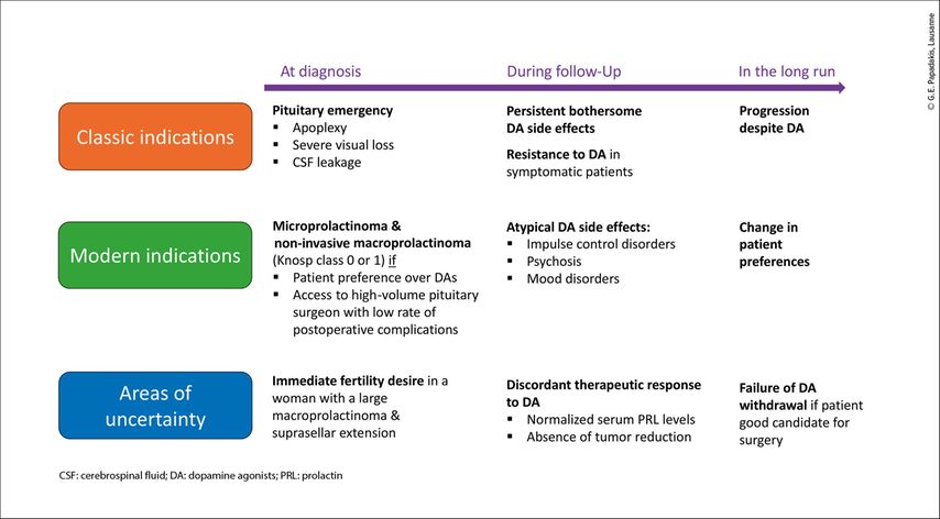 Fig. 1: Indications for surgery in prolactin-secreting pituitary neuroendocrine tumor (PitNETs). Graphic representations of possible indication for surgery in patients with prolactinoma over the course of the disease, as illustrated by the purple arrow