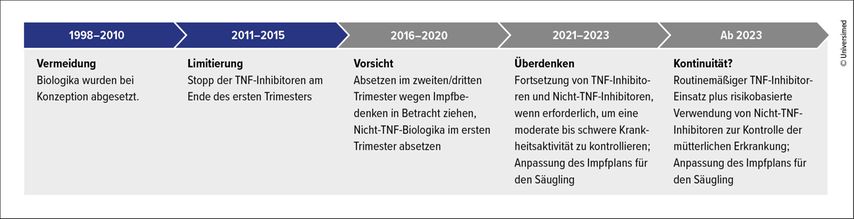Abb. 1: Zeitliche Entwicklung der Anwendung von biologischen DMARDs in der Schwangerschaft (nach Giles I et al. 2024)2