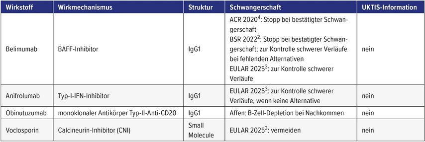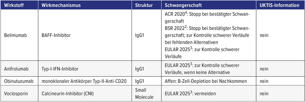 Tab. 1: Aktuelle Leitlinienempfehlungen und Schwangerschaftsevidenz zu ausgewählten innovativen SLE-Therapeutika
