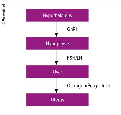 Etwa zwei Jahre nach der Thelarche ist mit einer ersten Menstruationsblutung zu rechnen. In den letzten Jahrzehnten zeigt sich ein Trend zu einem früheren Eintreten der Menarche. So haben Mädchen heutzutage im Durchschnitt mit 12,3 Jahren ihre Menarche. Was genau den Beginn der Pubertät auslöst, ist weiterhin unklar. Das Ausschütten von GnRH (Gonadotropin-releasing-Hormon) aus dem Hypothalamus stimuliert die Hypophyse zum Freisetzen von LH (luteinisierendes Hormon) und FSH (Follikel-stimulierendes Hormon). Diese stimulieren die Ovarien und bewirken eine Ausschüttung von Östrogen und Progesteron. Dadurch beginnen das Brustwachstum sowie der Weissfluss und es kommt schliesslich zur Menarche. Der Regelkreis ist etwas komplexer als in Abbildung 1 dargestellt und unterliegt pulsatilen Schwankungen sowie diversen Rückkopplungsmechanismen. Wenn dieser Regelkreis an einer Stelle gestört wird, können Zyklusstörungen auftreten.