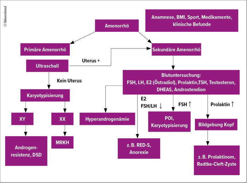 Die diagnostischen Schritte umfassen eine genaue Anamnese mit körperlicher Untersuchung hinsichtlich sekundärer Geschlechtsmerkmale (Pubesbehaarung und Brustentwicklung), Körpergrösse und -gewicht sowie einen transabdominalen Ultraschall und eine Medikamentenanamnese. Der Bedarf an Verhütungsmitteln sollte miterfasst werden. Ein Schwangerschaftstest zum Ausschluss einer Schwangerschaft gehört auch zur Diagnostik. Im Rahmen der Familienanamnese wird unter anderem nach dem Menarchealter der Mutter und der ersten Rasur vom Vater gefragt, um eine konstitutionelle Entwicklungsverzögerung (KEV) zu erfassen.