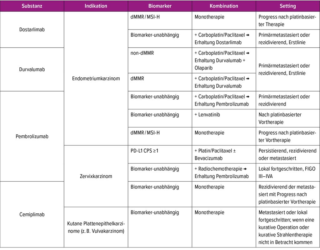 In der gynäkologischen Onkologie haben Immuncheckpoint-Inhibitoren, insbesondere Antikörper gegen PD-1 (z.B. Pembrolizumab, Dostarlimab, Nivolumab) oder PD-L1 (z.B. Atezolizumab), zunehmend an Bedeutung gewonnen. Ihr Einsatz basiert auf der Blockade von Immuncheckpoints, die Tumorzellen nutzen, um der Immunabwehr zu entkommen. Besonders bei PD-L1- positiven oder mikrosatelliteninstabilen (MSI) bzw. Tumoren mit der Defizienz der Mismatch-Reparatur (dMMR) wurde eine hohe Wirksamkeit beobachtet. Die aktuellen Indikationen mit Zulassung für die Immuncheckpoint-Inhibitoren im Bereich der gynäkologischen Onkologie sind in der Tabelle 2 zusammengefasst.