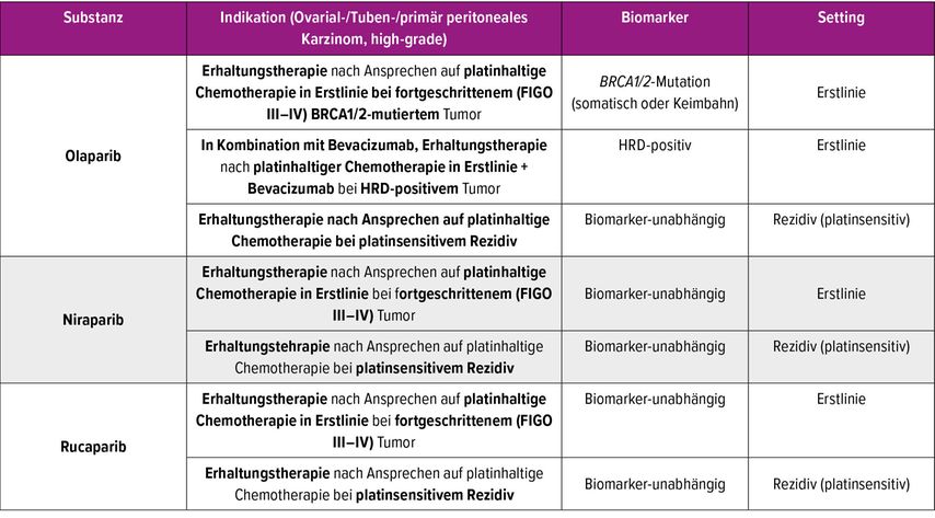 Ein paradigmatischer Durchbruch in der Behandlung des epithelialen Ovarialkarzinoms gelang durch den Einsatz von PARP-Inhibitoren. Diese Substanzen nutzen das Konzept der „synthetischen Letalität“: Tumorzellen mit Defekten in der homologen Rekombinationsreparatur (HRD), insbesondere BRCA1/2-Mutationen, sind besonders anfällig für die Blockade der PARP-vermittelten DNA-Reparatur. Aktuell sind PARP-Inhibitoren für die Erhaltungstherapie sowohl nach der Erstlinienbehandlung als auch im Rezidivsetting zugelassen. Die genauen Indikationen sind in der Tabelle 1 zusammengefasst.