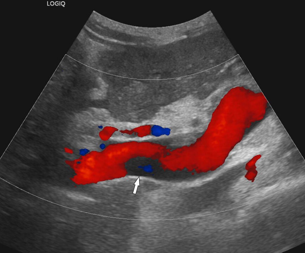 Abb. 1: Die farbcodierte Duplexsonografie zeigt einen wandständigen (nichtokklusiven) Thrombus (Pfeil) in der perfundierten Pfortader