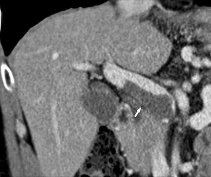 Abb. 2: Die Kontrastmittel-verstärkte MDCT (koronale 3D-Rekonstruktion) kann das Ausmaß einer PVT exakt abbilden: Die Thrombose ist nur im Pfortaderhauptstamm lokalisiert (Pfeil)