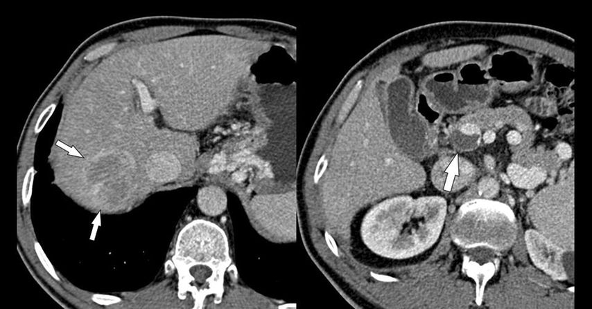 Abb. 4: HCC und PVT: Das HCC im rechten Leberlappen (kleine Pfeile links) hat keinerlei Verbindung zum (blanden) Thrombus im Pfortaderhauptstamm, der kein Kontrastmittel aufnimmt (großer Pfeil)