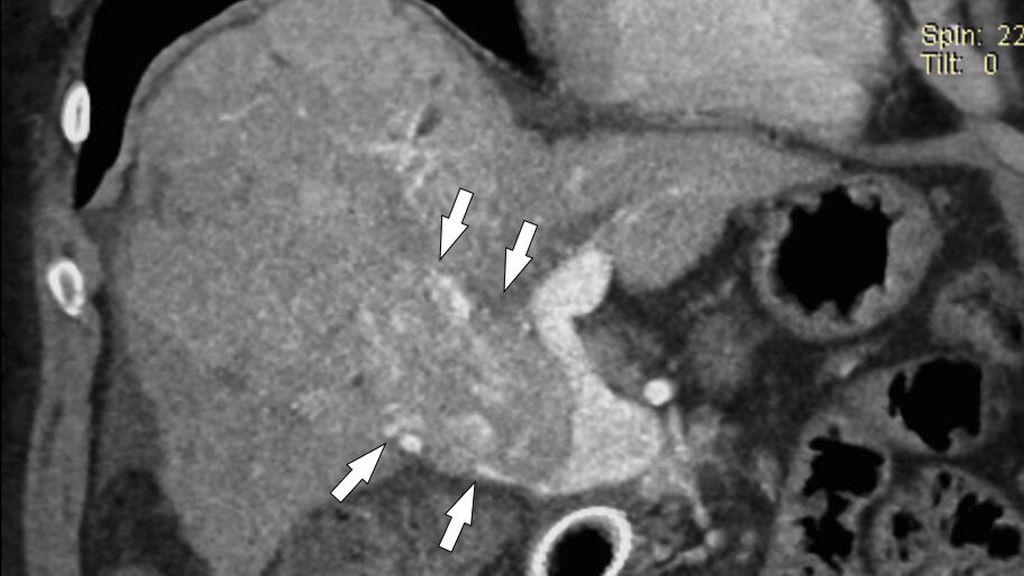Abb. 5: HCC mit Tumoreinbruch in die Pfortader: Die MDCT (koronale 3D-Rekonstruktion) zeigt den Kontrastmittel-aufnehmenden Tumor, der vom rechten Leberlappen in den rechten Pfortaderast vorwächst und diesen massiv aufweitet (Pfeile)