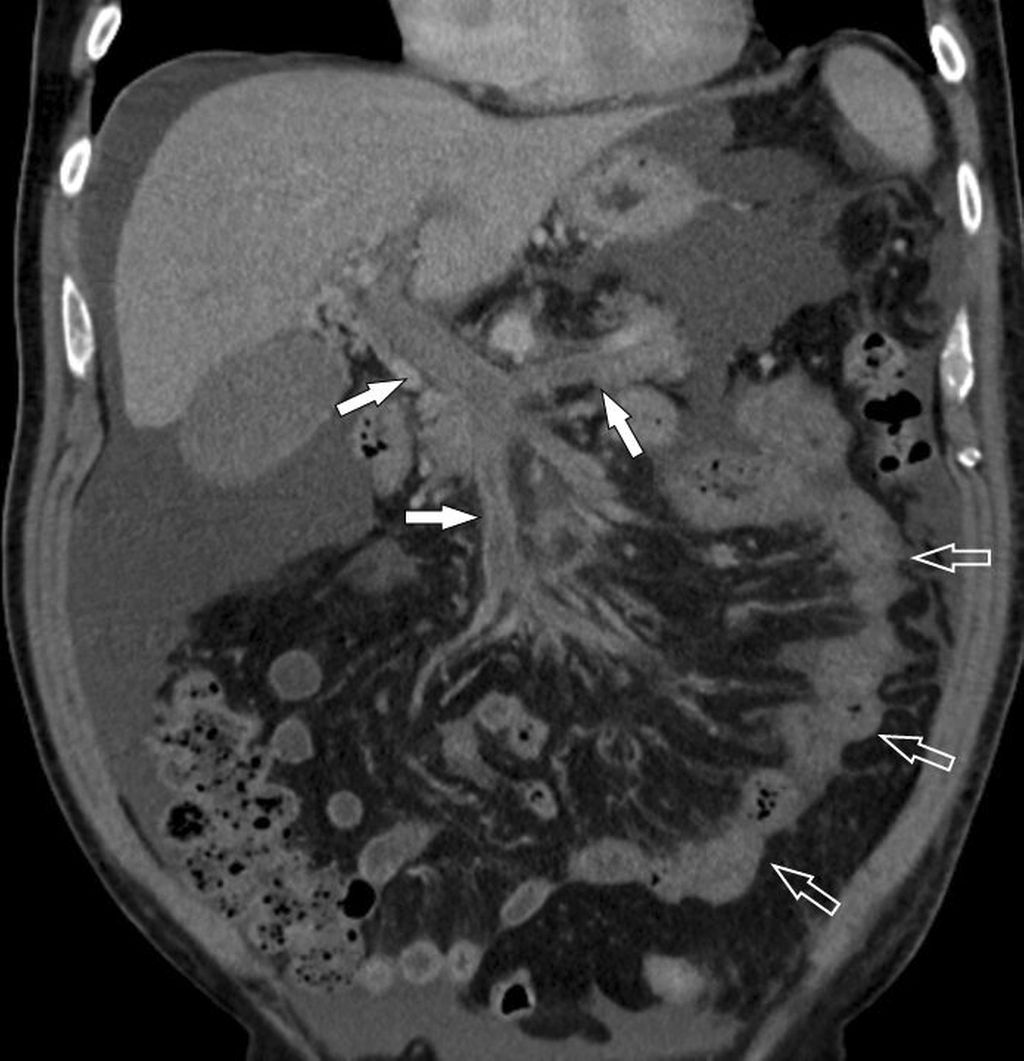 Abb. 6: Pfortader- und Mesenterialvenenthrombose: Die MDCT zeigt die ausgedehnte Thrombose (Pfeile oben) und den ischämischen, wandverdickten Dünndarm (offene Pfeile). In der Laparotomie fand sich eine Dünndarmnekrose