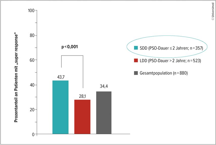 Abb. 1: GUIDE-Studie – Patienten mit einer PSO-Dauer ≤2 Jahren erreichten am häufigsten eine „super response“ unter Guselkumab (modifiziert nach Schäkel et al. 2023)2