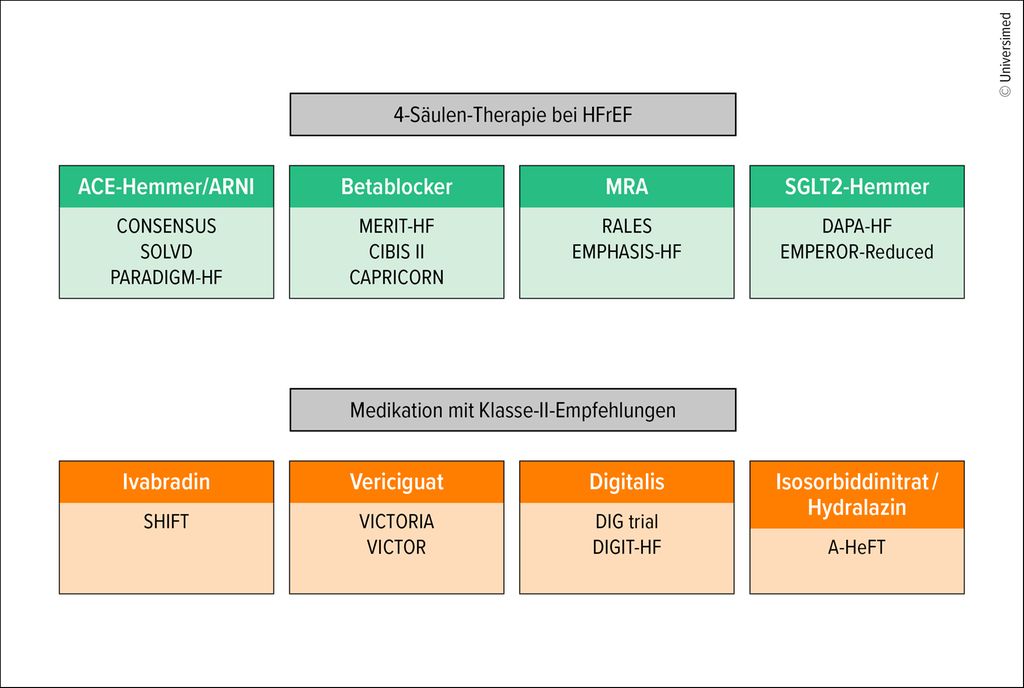 1 McDonagh TA et al.: 2021 ESC Guidelines for the diagnosis and treatment of acute and chronic heart failure. Eur Heart J 2021; 42: 3599-726 2 Ge Z et al.: Pathogenesis and pathophysiology of heart failure with reduced ejection fraction: translation to human studies. Heart Fail Rev 2019; 24: 743-58 3 SOLVD Investigators et al.: Effect of enalapril on survival in patients with reduced left ventricular ejection fractions and congestive heart failure. N Engl J Med 1991; 325: 293-302 4 McMurray JJV et al.: Angiotensin-neprilysin inhibition versus enalapril in heart failure. N Engl J Med 2014; 371: 993-1004 5 Hjalmarson A et al.: Effects of controlled-release metoprolol on total mortality, hospitalizations, and well-being in patients with heart failure: the Metoprolol CR/XL randomized intervention trial in congestive heart failure (MERIT-HF). MERIT-HF Study Group. JAMA 2000; 283: 1295-302 6 CIBIS-II Investigators and Committees: The cardiac insufficiency bisoprolol study II (CIBIS-II): a randomised trial. Lancet 1999; 353: 9-13 7 Dargie HJ: Effect of carvedilol on outcome after myocardial infarction in patients with left-ventricular dysfunction: the CAPRICORN randomised trial. Lancet 2001; 357: 1385-90 8 Kotecha D et al.: Efficacy of β blockers in patients with heart failure plus atrial fibrillation: an individual-patient data meta-analysis. Lancet 2014; 384: 2235-43 9 Pitt B et al.: The effect of spironolactone on morbidity and mortality in patients with severe heart failure. Randomized aldactone evaluation study investigators. N Engl J Med 1999; 341: 709-17 10 Zannad F et al.: Eplerenone in patients with systolic heart failure and mild symptoms. N Engl J Med 2011; 364: 11-21 11 McMurray JJV et al.: Dapagliflozin in patients with heart failure and reduced ejection fraction. N Engl J Med 2019; 381: 1995-2008 12 Packer M et al.: Cardiovascular and renal outcomes with Empagliflozin in heart failure. N Engl J Med 2020; 383: 1413-24 13 Jaiswal A et al.: SGLT2 inhibitors among patients with heart failure with preserved ejection fraction: a meta-analysis of randomised controlled trials. Medicine (Baltimore) 2023; 102: e34693 14 Armstrong PW et al.: Vericiguat in patients with heart failure and reduced ejection fraction. N Engl J Med 2020; 382: 1883-93 15 Butler J et al.: Vericiguat in patients with chronic heart failure and reduced ejection fraction (VICTOR): a double-blind, placebo-controlled, randomised, phase 3 trial. Lancet 2025; 406: 1341-50 16 Digitalis Investigation Group: The effect of digoxin on mortality and morbidity in patients with heart failure. N Engl J Med 1997; 336: 525-33 17 Rathore SS et al.: Association of serum digoxin concentration and outcomes in patients with heart failure. JAMA 2003; 289: 871-78 18 Bavendiek U et al.: Digitoxin in patients with heart failure and reduced ejection fraction. N Engl J Med 2025; 393: 1155-65 19 McDonagh TA et al.: 2023 focused update of the 2021 ESC guidelines for the diagnosis and treatment of acute and chronic heart failure. Eur Heart J 2023; 44: 3627-39 20 Mebazaa A et al.: Safety, tolerability and efficacy of up-titration of guideline-directed medical therapies for acute heart failure (STRONG-HF): a multinational, open-label, randomised, trial. Lancet 2022; 400: 1938-52 21 Schjødt I et al.: Real-world use of guideline-directed therapy for heart failure: Insights from the danish heart failure registry. ESC Heart Fail 2025; 12: 3003-17 22 Zhang Z et al.: Advancing guideline-directed medical therapy in heart failure: overcoming challenges and maximizing benefits. Am J Cardiovasc Drugs 2024; 24: 329-42