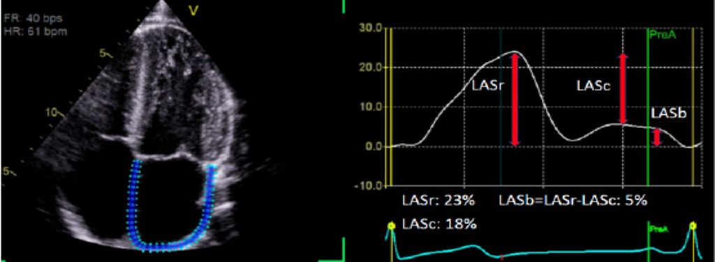 Abb. 1: Abbildung eines LA Strain mit eingezeichnetem Strain. Abkürzungen: LASr = „Left atrial reservoir strain“ LASc = „Left atrial conduit strain“ LASb = „Left atrial booster strain“