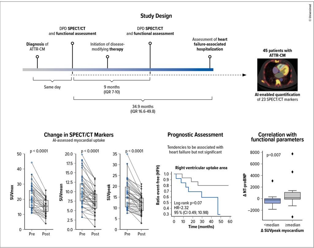 Die Studienkohorte umfasste 45 Patient:innen mit ATTR-CM, die eine amyloidspezifische Therapie, wie TTR-Stabilisatoren (Tafamidis) oder TTR-Silencer (Patisiran, Inotersen), erhielten und sich sowohl vor Therapiebeginn als auch nach neun Monaten im Rahmen eines Follow-ups einer SPECT/CT-Bildgebung unterzogen. Die KI-gestützte Segmentierung der kardialen Strukturen erfolgte mithilfe eines Deep-Learning-Modells, das die automatisierte Extraktion von 23 quantitativen Markern ermöglichte, darunter Intensitäts- und Volumenmarker des Tracer-Uptakes sowie der Retentionsindex über verschiedene kardiale Substrukturen. Darüber hinaus wurden funktionelle Parameter – einschließlich klinischer und laborchemischer Variablen – sowie klinische Endpunkte hinsichtlich ihrer Assoziation mit Veränderungen der SPECT/CT-Marker vor und nach der Behandlung untersucht.
