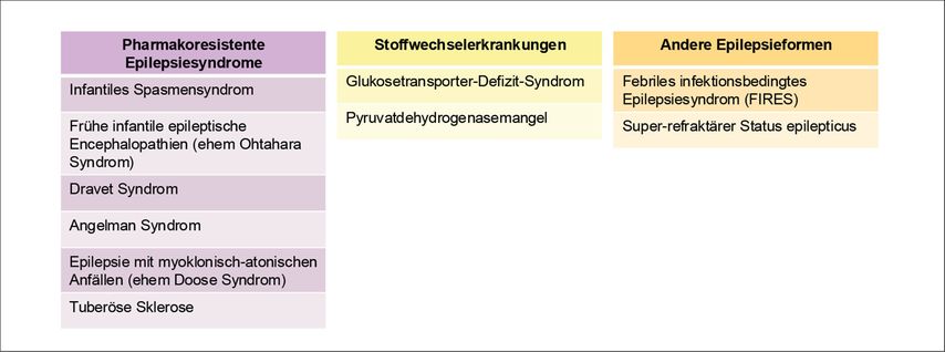 Abb.3: Ketogene Ernährungstherapien werden bei verschiedenen Epilepsien und genetischen Syndromen als effektiv beschrieben. Diese lassen sich in 3 Gruppen aufteilen: pharmakoresistente Epilepsiesyndrome, Stoffwechselerkrankungen und andere Epilepsieformen (adaptiert nach Kossoff EH et al., Epilepsia Open 2018)3