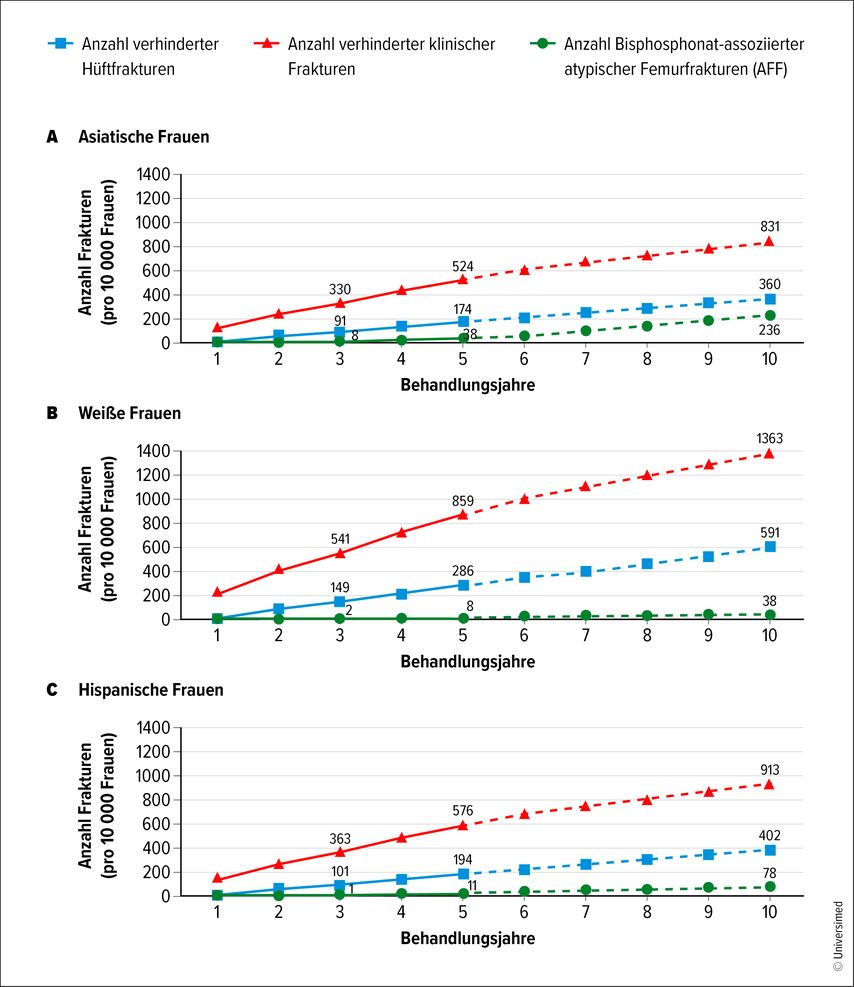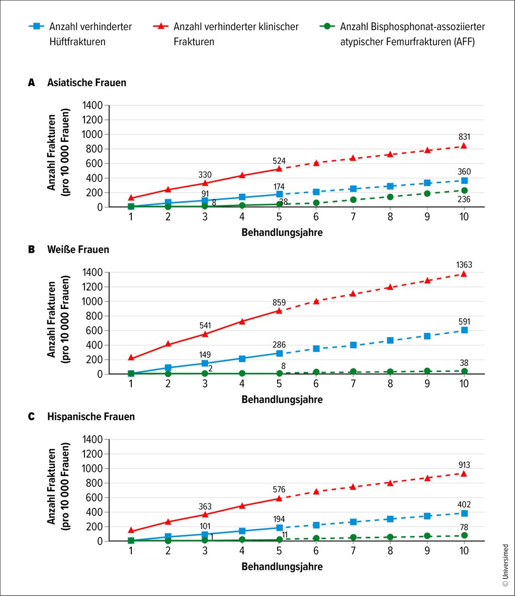 Abb. 2: Verhinderte Hüft- und klinische Frakturen im Vergleich zu AFF im Zusammenhang mit Bisphosphonatanwendung. Dargestellt ist die Anzahl der Frakturen in Abhängigkeit von den Jahren der Bisphosphonatbehandlung, aufgeschlüsselt nach ethnischer Zugehörigkeit. Durchgezogene Linien für die Jahre 1 bis 5 weisen auf eine stärkere Evidenzbasis für die Reduktion des Risikos für Hüft- und klinische Frakturen unter Bisphosphonatbehandlung in den ersten 5 Behandlungsjahren hin als für Risikoreduktionen nach 5 Jahren. Modifiziert nach Black DM et al. 20203
