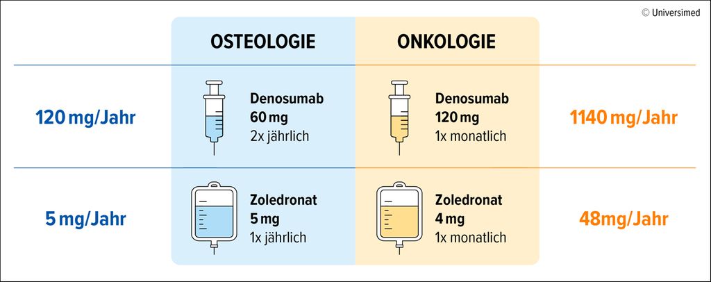 Dies führt auch zu einem weiteren Mythos, nämlich „von Bisphosphonaten oder Denosumab fallen einem alle Zähne aus“. In diesem Zusammenhang verwies Kocijan auf Paracelsus: „Die Dosis macht das Gift.“ Wobei ein Vergleich zwischen den in der Osteologie und in der Onkologie eingesetzten Dosierungen Klarheit schafft. So wird z.B. Zoledronat in der Osteologie mit 5mg pro Jahr dosiert, in der Onkologie jedoch mit 48mg pro Jahr. Bei Denosumab sind es 120mg/Jahr in der Osteologie und 1440mg/Jahr in der Onkologie (Abb. 1). Während bei onkologischen Dosierungen das Risiko für Kiefernekrosen nicht unterschätzt werden darf, ist es bei osteologischen Dosierungen minimal. Dennoch sollte bei zahn- oder kieferchirurgischen Eingriffen vorsichtig vorgegangen werden. Die Gabe von Denosumab kann nach einem Eingriff für einen Monat verzögert werden, wenn die Alveole nicht abgeheilt ist. Bis zur Abheilung der Alveole sollten auch i.v. Bisphosphonate vermieden werden. Für orale Bisphosphonate gibt es keine Empfehlungen. Kocijan: „Man könnte die oralen Bisphosphonate weiterlaufen lassen,4 wir pausieren sie allerdings in der Regel.“