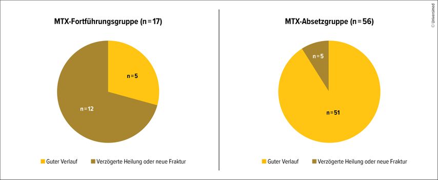 Abb. 2: Vergleich des Verlaufs in Abhängigkeit vom MTX-Management. Ein schlechter Verlauf wurde definiert als anhaltende Schmerzen, wiederkehrende Frakturen oder verzögerte Heilung. MTX = Methotrexat, modifiziert nach Robin F 20256