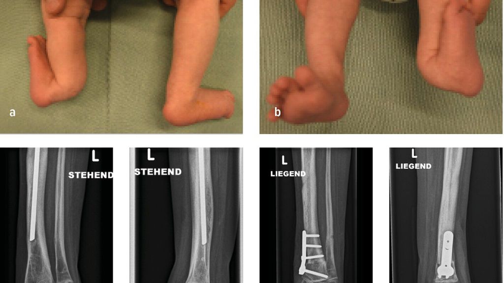 Die genaue Epidemiologie und Pathogenese des posteromedialen Bowings, auch bekannt als Crus valgum recurvatum, sind unbekannt. Einzelne dokumentierte Fälle in der Literatur lassen jedoch darauf schließen, dass es sich hierbei um eine sehr seltene Fehlstellung des Unterschenkels handelt, die vor allem die linke Extremität betrifft.15,16 Die Biegung der Tibia nach hinten und zur Körpermitte beträgt zwischen 25 und 70° und tritt typischerweise am Übergang vom mittleren zum distalen Drittel auf. In ausgeprägten Fällen kann die Fehlstellung bis zu 90° betragen. Der Fuß des Neugeborenen kann in schweren Fällen auf der Schienbeinkante zu liegen kommen. Bildlich repräsentiert dies der Fall eines 6 Wochen alten Mädchens mit posteromedialem Bowing der linken unteren Extremität mit typischer Biegung am Übergang vom mittleren zum distalen Drittel. Hier kommt der Fußrücken an der Unterschenkelkante zu liegen (Abb.3a,b). Differenzialdiagnostisch ist dabei an eine Calcaneo-valgus-Fehlstellung des Fußes zu denken.16 Eine spontane Rückbildung der Fehlstellung wird im Laufe des Wachstums bis zum 4.–5. Lebensjahr beobachtet.15 Konservative Maßnahmen beschränken sich initial auf sanfte Fußmassagen des Neugeborenen. In schweren Fällen kann eine graduelle Gipsredression eingesetzt werden.14