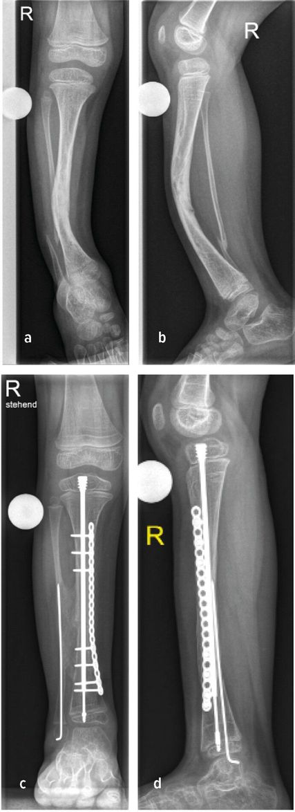 Rezente Klassifikation berücksichtigt die Integrität der Tibia und Fibula, die Stellung der distalen Fibula in der Gelenksgabel sowie das Vorhandensein knöcherner Defekte.11 Sowohl konservative Therapie zur Frakturvermeidung als auch operative Verfahren zur Korrektur der Fehlstellung stehen zur Verfügung: Orthesen, Anlage eines externen Fixateurs, intramedulläre Marknagelung, Transfer einer vaskularisierten Fibula oder Durchführung einer sogenannten Cross-Union (X-Union). Abbildung 2b zeigt hierzu den Fall einer Cross-Union-Operation mit Resektion der Pseudoarthrose, guter Knochenbrücke zwischen Tibia und Fibula (Cross-Union), Stabilisierung der Tibia mit intramedullärem Teleskopnagel und Platte, Stabilisierung der Fibula mit Bohrdraht (Abb.2c,d).11,12