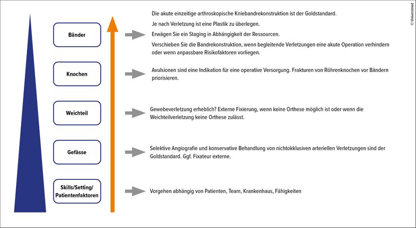 Die ersten Massnahmen richten sich danach, ob der Patient eine Gefässverletzung oder ein Kompartmentsyndrom hat. Ist das der Fall oder liegen offene Verletzungen oder ein Polytrauma vor (Injury Severity Score >16), lässt sich das Knie nicht reponieren oder bleibt nicht in Reposition, dann empfehlen Frosch und sein Hamburger Team ein zweizeitiges Vorgehen.2 Nach Kompartmentspaltung und/oder Gefässrekonstruktion wird das Knie im Fixateur externe ruhiggestellt. Erst dann erfolgen weitere Diagnostik und Therapie. Das Hamburger Team empfiehlt MRT-fähige Fixateure, da die Bildgebung bei anliegendem Fixateur problematisch sein kann. Ein Fixateur externe sei nicht obligatorisch,2 in unkomplizierten Fällen könne das Knie meist in einer Hartrahmenorthese fixiert werden. Liegen keine grösseren Begleitverletzungen oder Komplikationen vor, ist nach dem Knieröntgen eine MRT indiziert. «In der Aufnahme sollte man neben dem für die weitere Therapie wichtigen Verletzungsmuster der Bänder auf relevante Begleitverletzungen achten, zum Beispiel Meniskuswurzelverletzungen, um die weitere Behandlung gezielt planen zu können», sagte Henkelmann. In seinem Vortrag stellte er einen weiteren Therapiealgorithmus vor, eine «Pyramide der Prioritäten» (Abb. 4). Es helfe vor allem in der Notfallsituation, wenn man sich die Prioritäten klar vor Augen halte, sagte er: «Erst kommen die Gefässe, dann Weichteile und Knochen und zum Schluss können wir uns um die Bänder kümmern.»