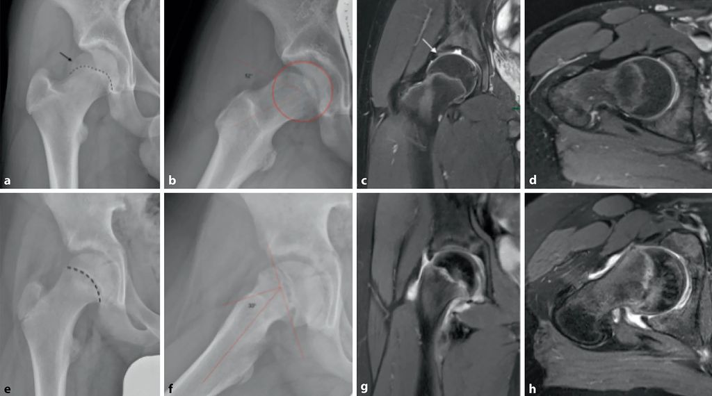 Abb. 2: a–d: Idiopathische Cam-Morphologie bei einem 14-jährigen Leistungssport-Fußballer mit trainingsassoziiertem Leistenschmerz rechts. Vorderer Impingement-Test positiv. Die Wachstumsfuge ist noch nicht verschlossen. Im anteroposterioren Projektionsröntgen (a) epiphysäre Extension (gestrichelte Linie, Pfeil). In der Dunn-View (b) zeigt sich eine Offset-Verminderung durch die inzipiente Cam-Morphologie mit einem Alpha-Winkel von 52°. Die MRT (c) zeigt eine geringe Formalteration des acetabulären Erkers sowie zumindest eine Labrumdegeneration in der chondrolabralen Transitionszone (Pfeil). Im axialen MRT (d) zeigt sich die Cam-Morphologie analog zum Röntgen. e–h: 12-jähriger Patient mit Schmerzen im Bereich des rechten Hüftgelenkes seit ca. 2 Monaten. Positives Drehmann-Zeichen mit aufgehobener Innenrotation in 90° Beugung. Im anteroposterioren Projektionsröntgen (e) findet sich eine deutlich erweiterte Physenfuge rechts. In der Lauenstein-Aufnahme (f) findet sich mit einem Southwick-Winkel von 33° eine moderat abgeglittene Epiphyse, die zu einer sekundären Cam-Morphologie führt; in der MRT (g, h) ist das Ausmaß dreidimensional bestimmbar; zudem zeigt sich ein Knochenmarködem (aus Chiari et al. 2022)5