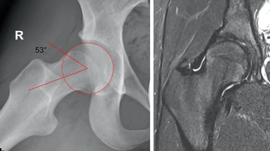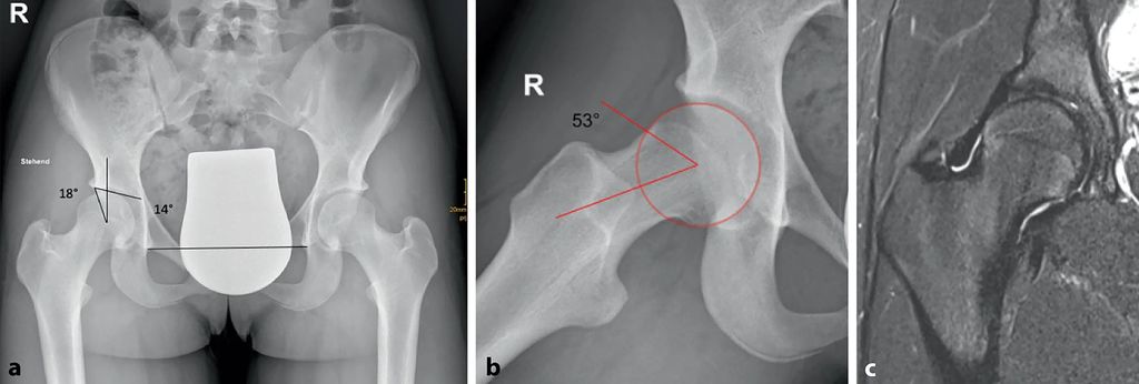 Abb. 1: 14-jährige aktive Balletttänzerin mit Schmerzen bei starker Abduktion und Außenrotation. Im Projektionsröntgen ap (a) zeigt sich eine Grenzdysplasie (LCE-Winkel 18°, Tragflächenwinkel 14°), in der Dunn-View (b) ein verminderter femoraler Offset mit einem Alpha-Winkel von 53,4°. Die MRT (c) zeigt ein geringgradiges Knochenmarködem am Kopf-Schenkelhals-Übergang als Zeichen des FAI (aus Chiari et al. 2022)5