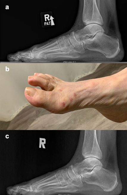 Abb. 1: 72-jährige Patientin mit Hallux rigidus und prominentem dorsalem Osteophyten mit guter Beweglichkeit im MTP-Gelenk: a) präoperatives Röntgenbild lateral belastend, b) 12 Wochen postoperativ nach perkutaner Cheilektomie; keine Schwellung, minimale Narben, c) Röntgenbild 12 Wochen postoperativ