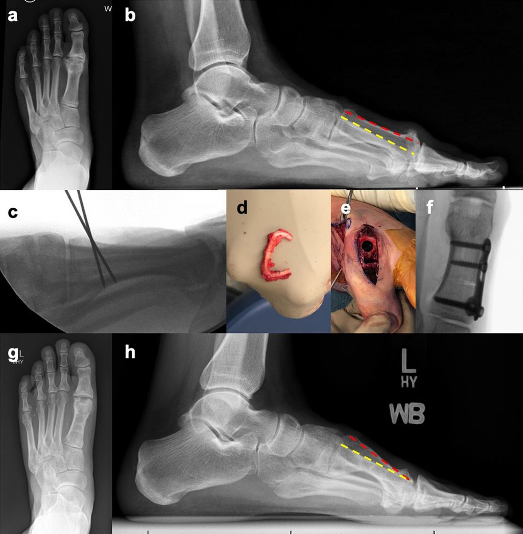 Abb. 2: 46-jähriger Patient mit einem symptomatischen Hallux rigidus mit Elevation des 1. Strahls und einer Gastrocnemius-Kontraktur: a) a/p-Röntgen (Rö) mit Gelenksspaltverschmälerung und Osteophyten, b) Laterales Röntgen zeigt eine Elevation des Metatarsale (MT) 1 (rot) in Relation zum MT 2 (gelb). Der operative Plan inkludierte eine endoskopische Gastrocnemius-Rezession, eine plantare flektierende und verkürzende plantare „Closing wedge“-Osteotomie des proximalen Metatarsale 1 sowie eine Cartiva®-Implantation, c) Intraoperatives laterales Rö zeigt die geplante plantare „Closing wedge“-Osteotomie, d) Resektion plantarer Kortex des MT1, e) Präparation und Implantation eines 10mm-Cartiva®-Implantates, f) intraoperatives a/p-Rö nach Osteosynthese mit winkelstabiler Platte und Cartiva®-Implantation, g), h) 2 Jahre postoperativ a/p- und laterales Rö. Eine Metallentfernung fand in der Zwischenzeit statt. Der Patient zeigt eine verbesserte plantarflektierte Position des MT1, ein kongruentes Gelenk mit guter Beweglichkeit und Schmerzfreiheit