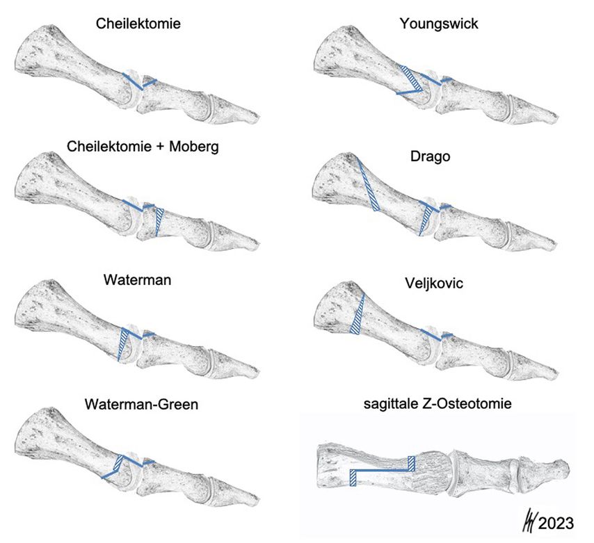 Prinzipiell können Osteotomien zur Behandlung des HR anhand der Lokalisation unterschieden werden: am MT1 distal und proximal, oder an der PP.