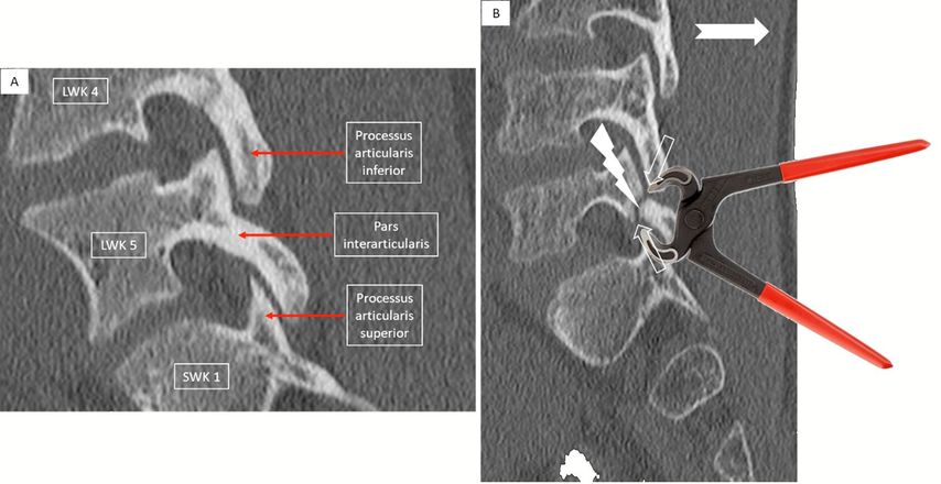 Abb. 1: Bild A zeigt einen sagittalen Schnitt einer Computertomografie (CT) der unteren Lendenwirbelsäule (LWS) mit intakter Pars interarticularis des 5. Lendenwirbels (LWK 5). Ebenfalls gekennzeichnet sind der Processus articularis inferior vom 4. Lendenwirbel (LWK 4) sowie der Processus articularis superior des 1. Sakralwirbels (SWK 1). Abbildung B illustriert den Pathomechanismus bei der Entstehung der isthmischen Spondylolyse (Defekt im Bereich der Pars interarticularis): Durch repetitive Reklination oder Rotation (ausgefüllter Pfeil) können der Processus articularis inferior des kranial gelegenen Wirbels und der Processus articularis superior des kaudalen Wirbels wie eine Kneifzange oder ein Nussknacker auf die Pars interarticularis drücken und zu einem Ermüdungsbruch (Blitz-Pfeil) führen